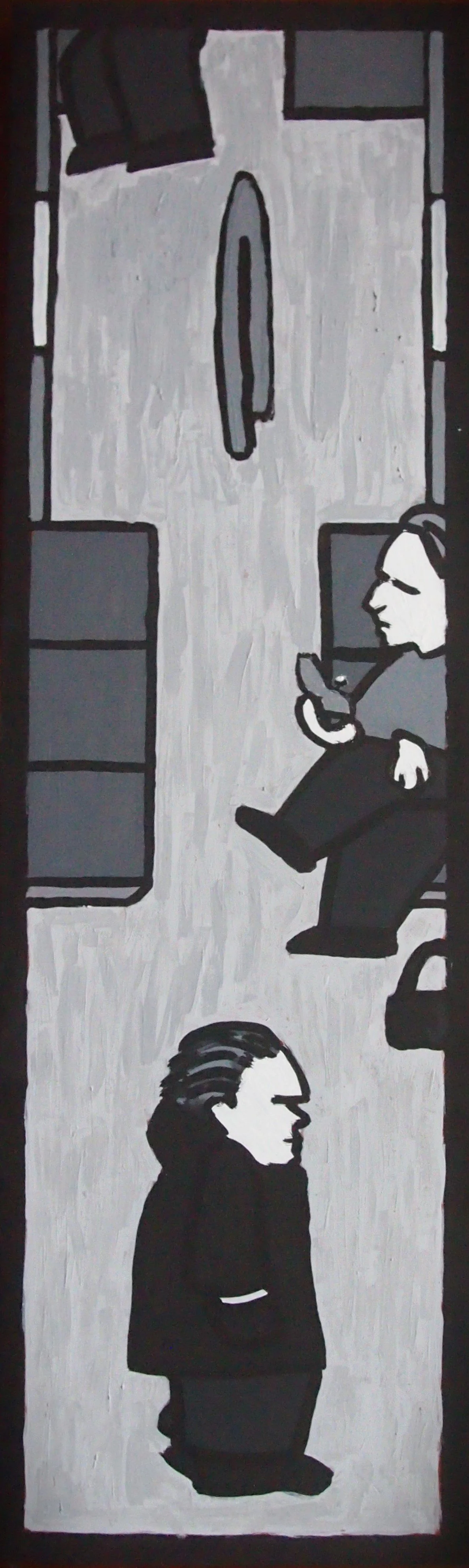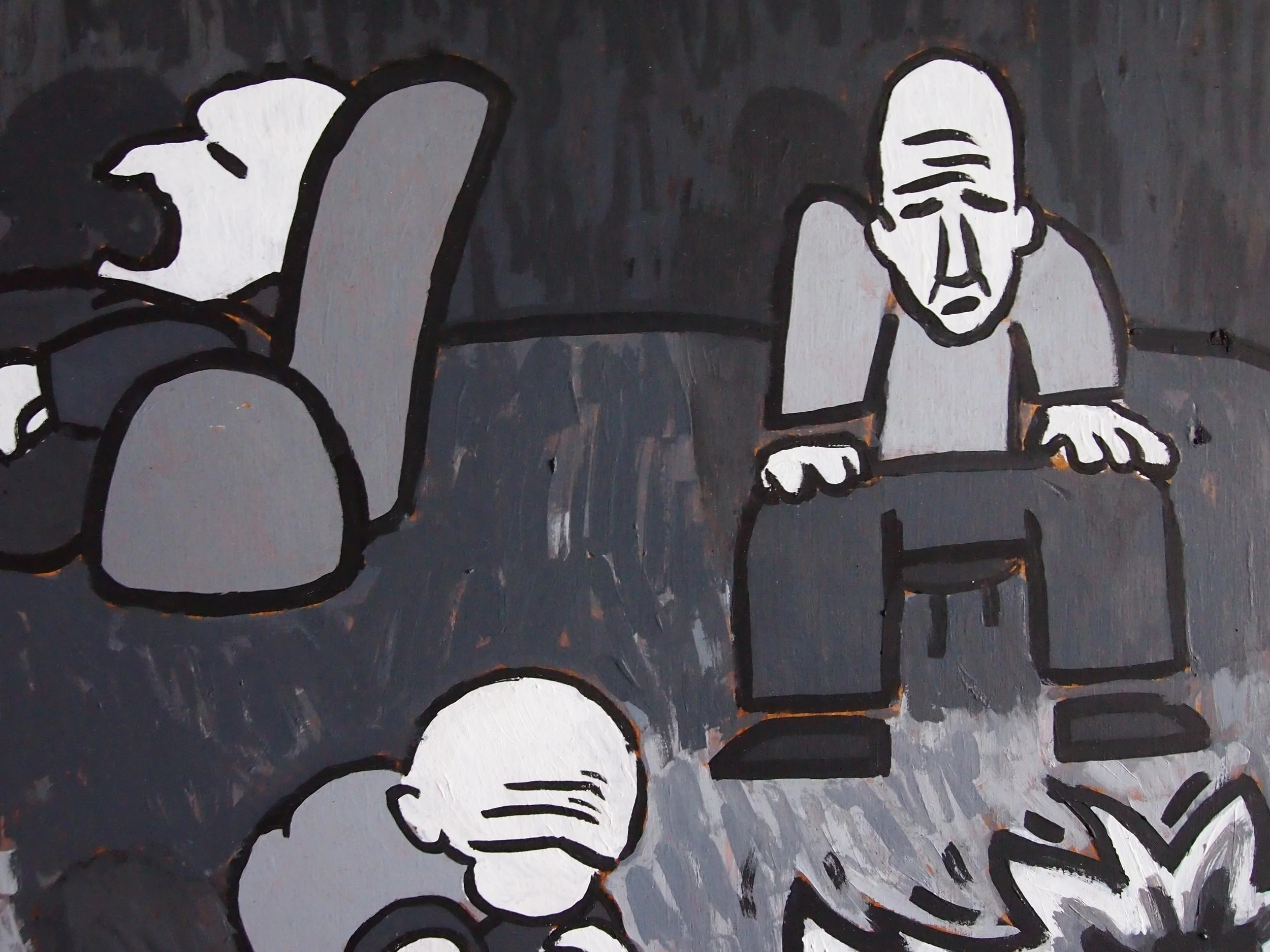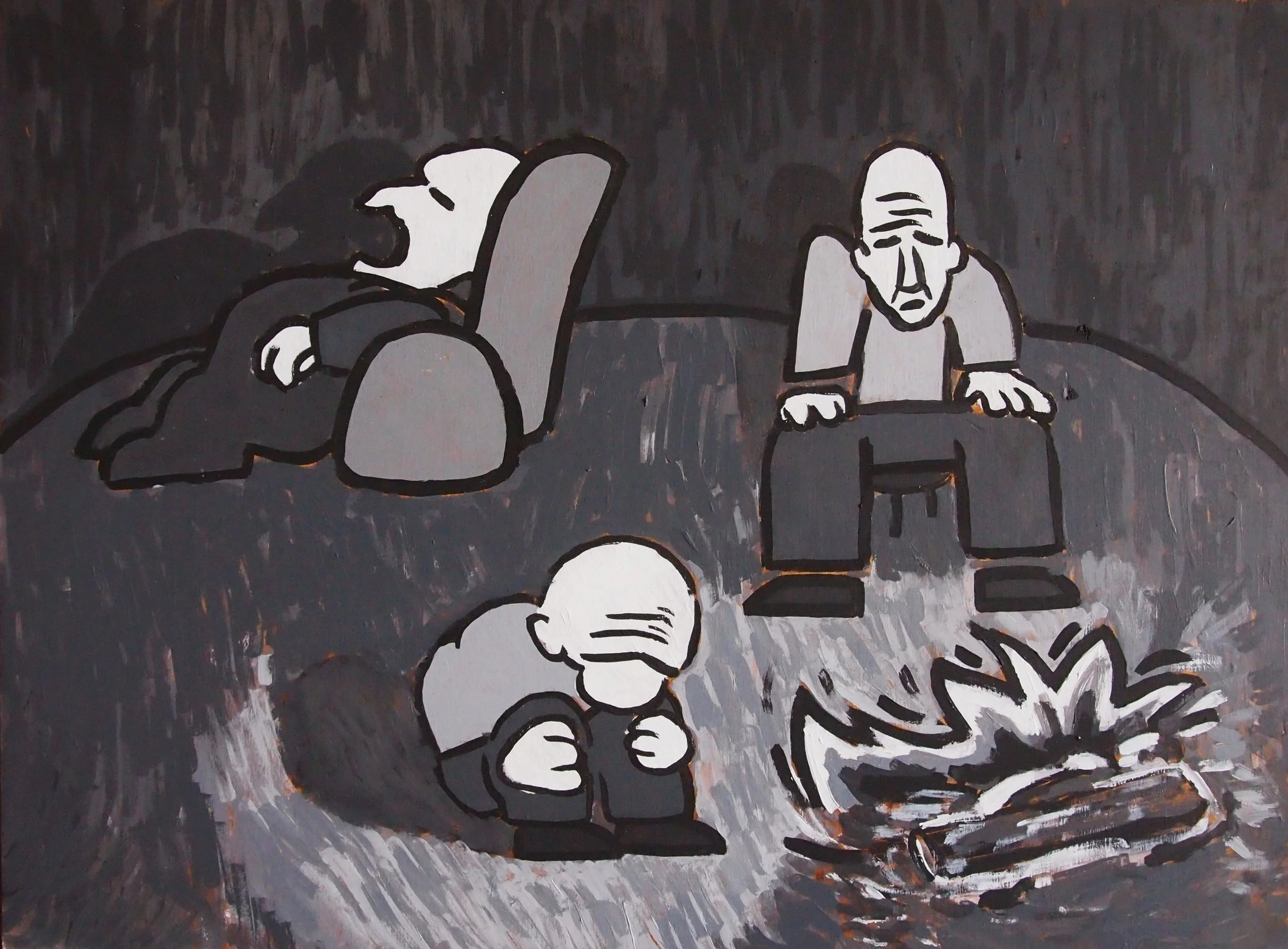 The series Ages of Man (I-III) is the artist’s first exploration using egg tempera as the sole artistic medium. In this manner, the artist fuses traditional practices with contemporary imagery. In each scene, three figures represent the three stages of “Man” (in a symbolic sense) throughout their lives. These scenes capture the circularity and randomness of life and our experiences. The characters are not naturalistic, and although they are cast with ridiculous countenances, they are relatable on an emotional, incorporeal, level.