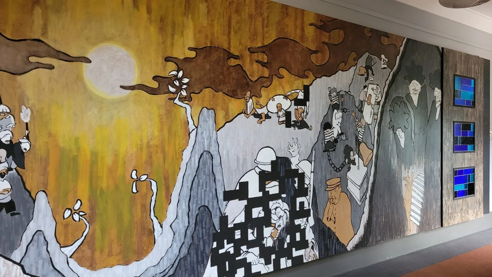 Symphony No. 1 - Ozymandias (Part 1), tempera and acrylic on wall panel accompanied by blue lead-lighting panels, 1400cm x 120cm, 2023