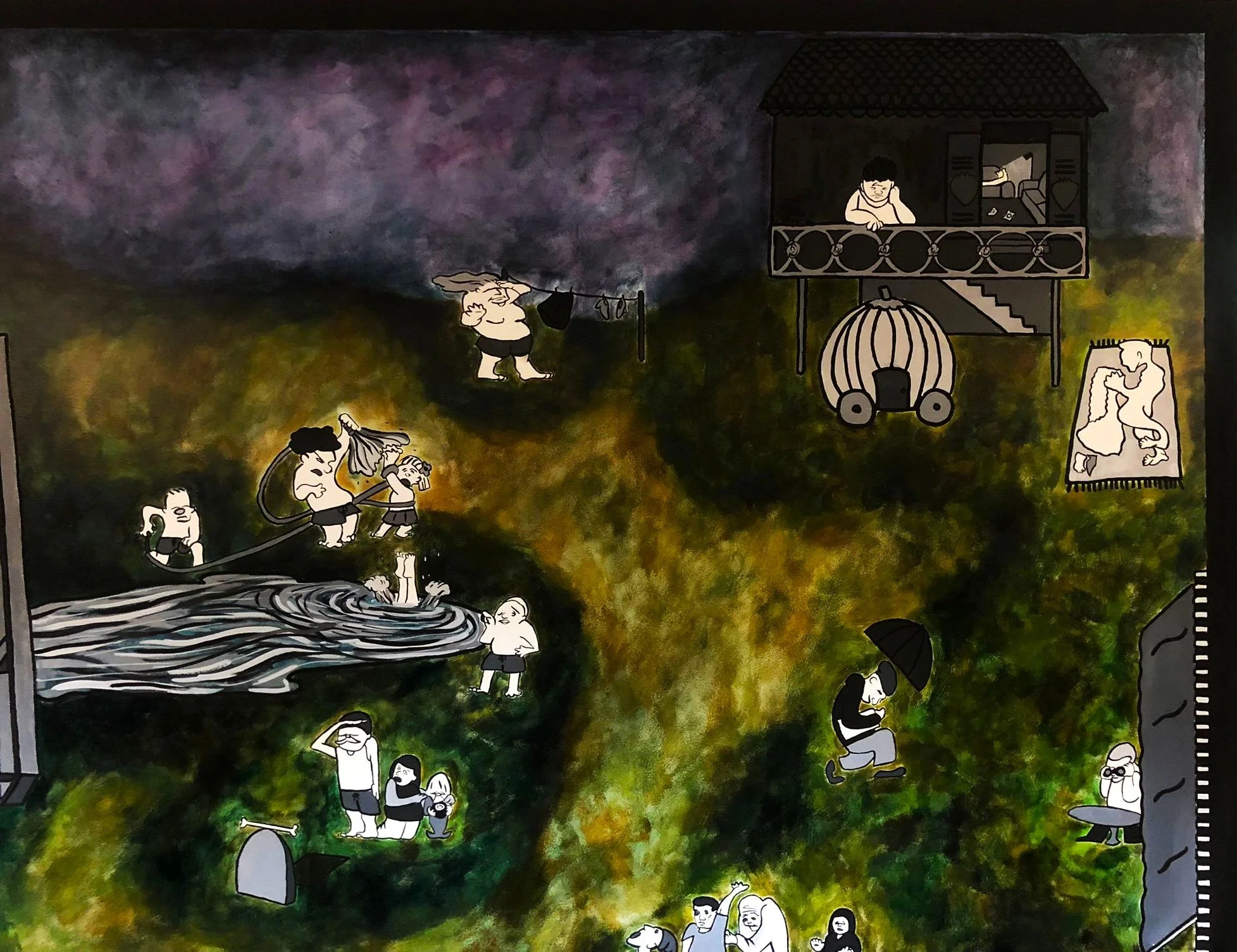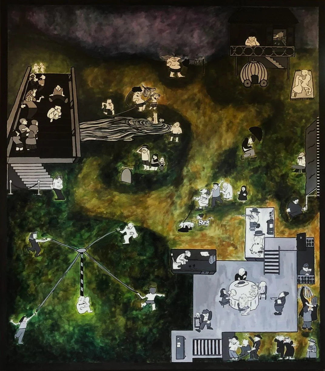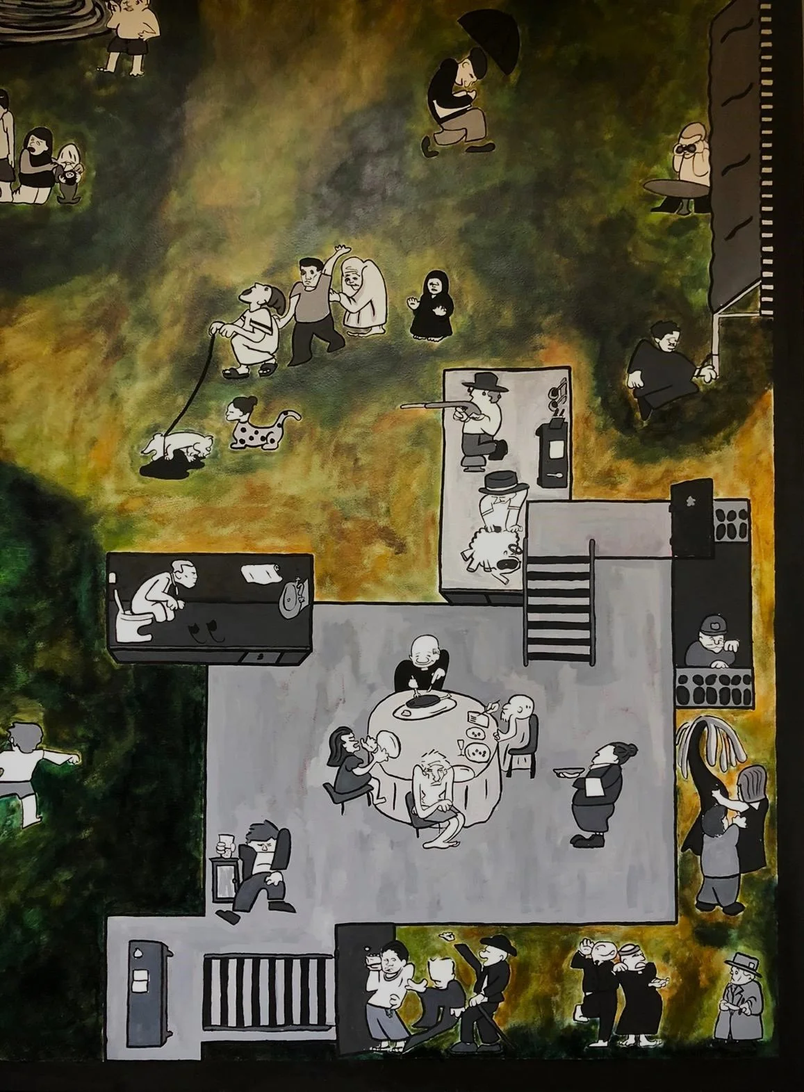 This work captures the eclectic nature of the human experience, highlighting the simultaneity of contradicting states such as turmoil and joy. This existentialistic nature is encapsulated in the various tragically-comic (and comically-tragic) narratives pervading the landscape. By disregarding a linear narrative structure in favour for isolated occurrences, the artist simultaneously conveys both the vast differences and distinct similarities of our collective experiences.
